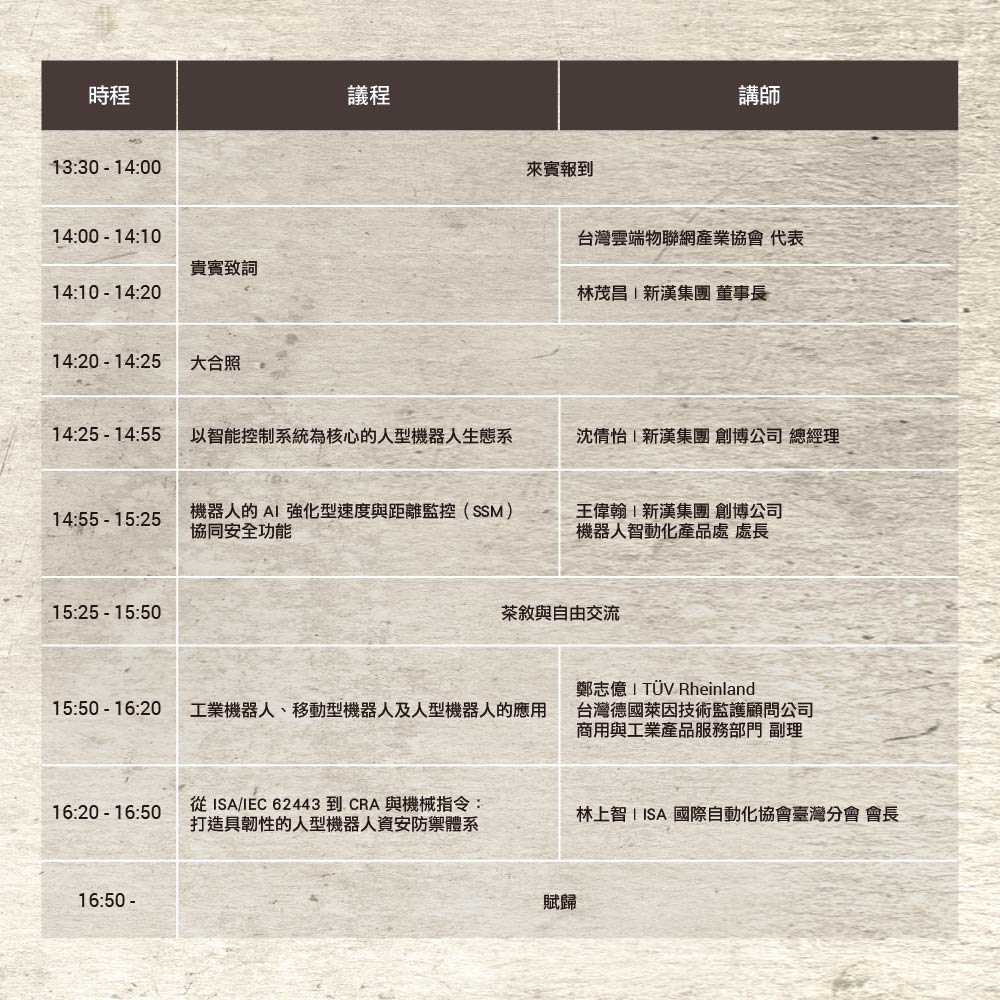 由台灣雲端物聯網產業協會主辦及 NEXCOM 新漢集團(8234)協辦的【台灣人型機器人啟動論壇】將於 2025 年 11 月 26 日舉辦首場系列論壇。本次論壇以「軟體定義機器人,共榮人型機器人產業鏈」為主軸,邀請產業專家包含 NEXCOM 新漢集團旗下創博 (NEXCOM Robotic Solutions)、德國萊因 (TÜV Rheinland)、國際自動化協會 (ISA) 等,針對人型機器人產業趨勢、AI 技術發展、機器人國際標準與法規進行深入淺出的專題演講。期望透過建立跨領域交流平台,加速台灣機器人產業鏈邁向產業升級與應用落地。誠摯邀請業界先進報名參加,一同開創台灣機器人生態鏈、共建具韌性的台灣人型機器人新局。